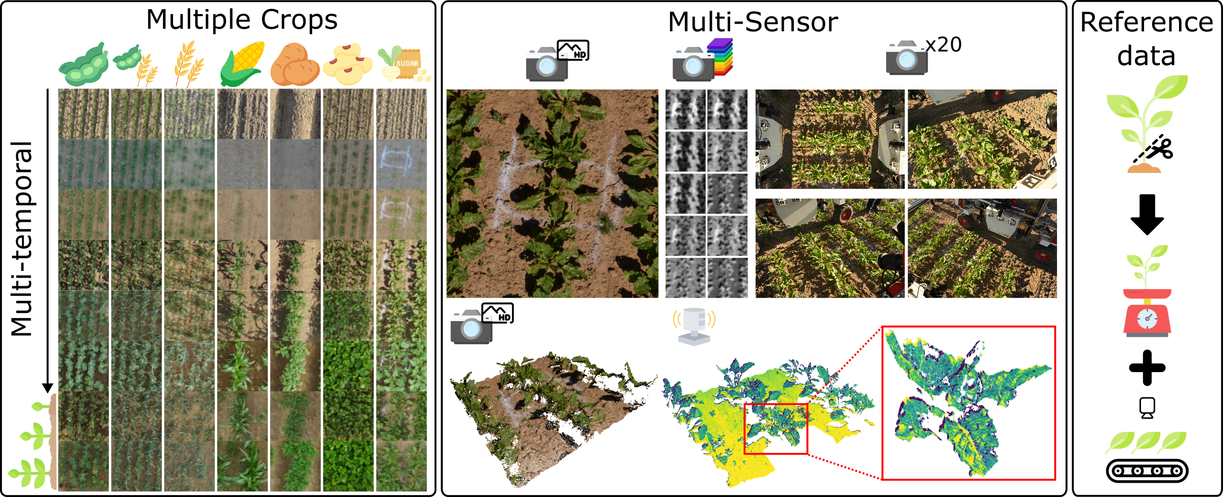 Phenotyping is crucial for understanding crop trait variation and advancing research, but is currently limited by expensive, labor-intensive monitoring. New methods are proposed to automate phenotypic trait monitoring and reduce this so-called phenotyping bottleneck. These methods are often data-driven, requiring a dataset for novel method development. In this paper, we present the MuST-C (Multi-Sensor, multi-Temporal, multiple Crops) data set, which contains field data from various platforms collected over one growing season, covering six different crop species. All data are georeferenced for alignment across sensors and dates. To collect our dataset, we deployed aerial and ground robotic platforms equipped with RGB cameras, LiDARs, and multispectral cameras to achieve not only a high variety of modalities but also varying viewpoints. In addition to sensor data, our data set provides destructively derived reference measurements of leaf area and biomass. Our data set enables the development of autonomous phenotypic trait estimation techniques, including novel multi-sensor approaches. Moreover, it allows method comparisons using different sensors and investigates their generalizability across crop species.